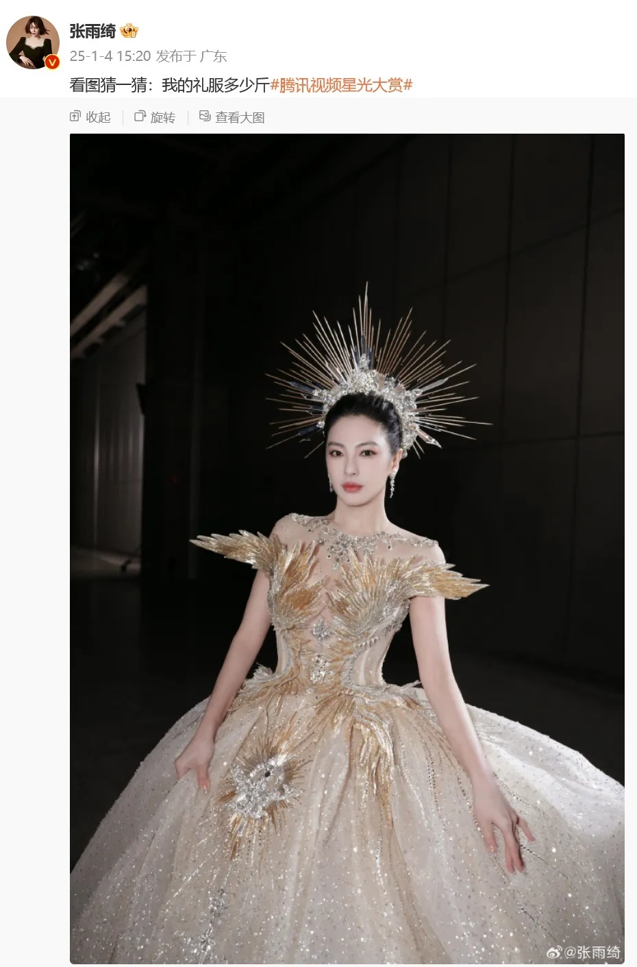 4日下午,张雨绮晒出自己的红毯造型提问:“看图猜一猜我的礼服多少斤?”