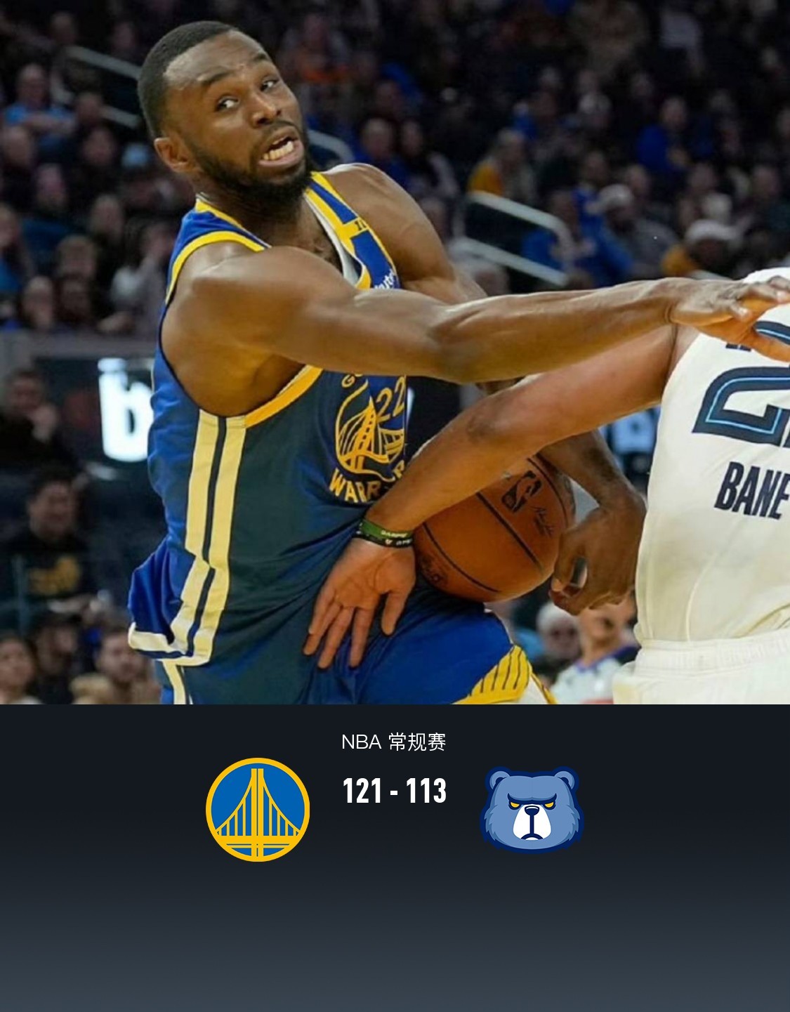 第四节勇士林迪-沃特斯拿下8分,灰熊小贾伦-杰克逊拿下8分,最终勇士121-113战胜灰熊