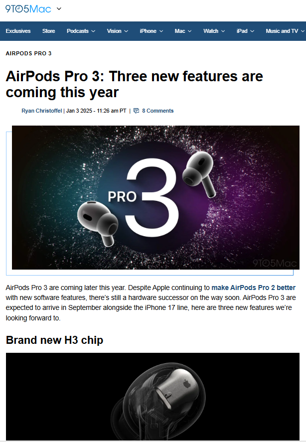 科技媒体 9to5Mac 昨日(1 月 3 日)发文称,苹果计划在今年9月推出AirPods Pro 3,预计与iPhone 17系列同步上市,新款耳机将带来多项新特性。