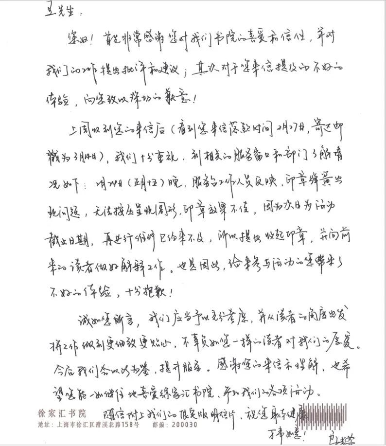 正如刘振纲所说,实际上,每一个来自读者的意见建议,书院都会认真听取并回复。比如,去年2月一位读者反映的盖章问题,马上就得到了馆长的手写回信。