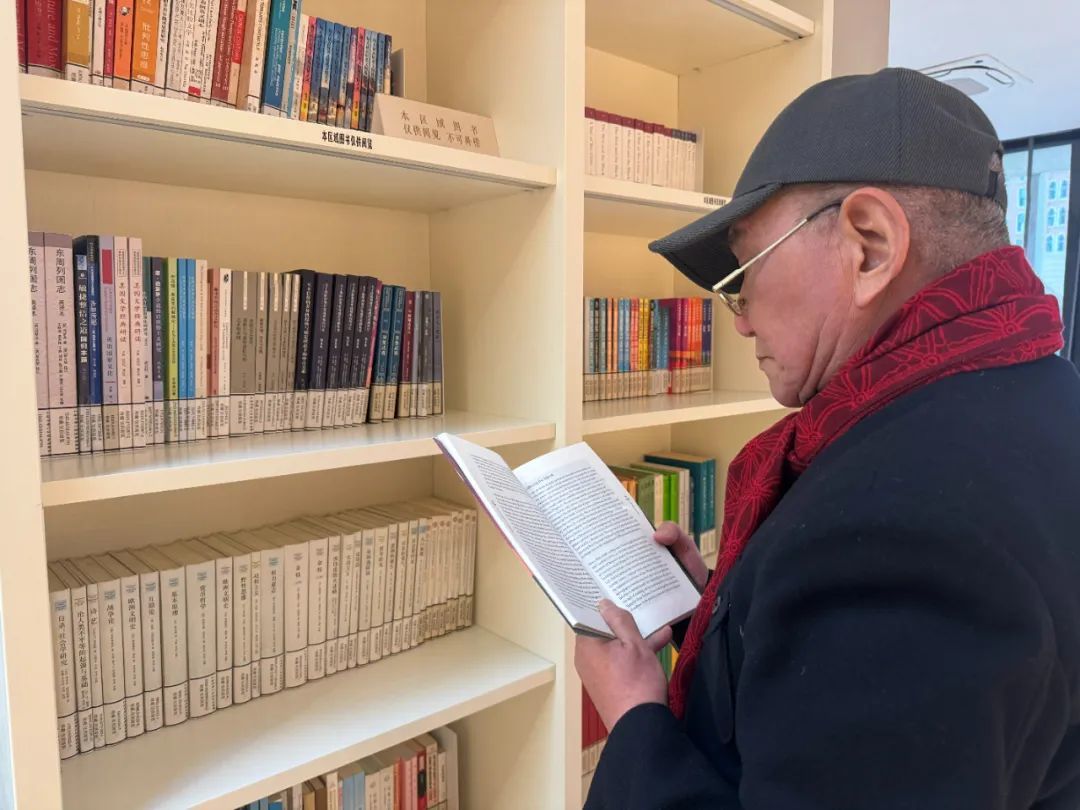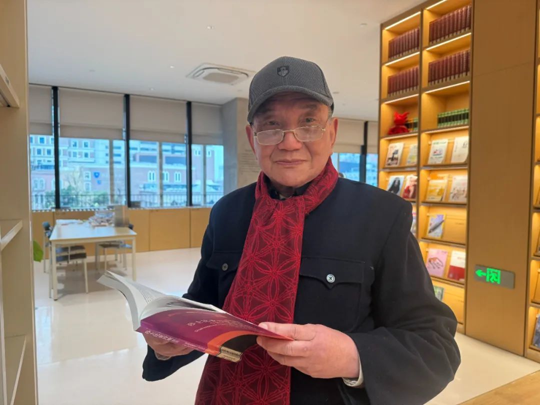 戴着老花眼镜,系着红围巾的刘振纲今年76岁,是追了徐汇区图书馆三代的老读者。