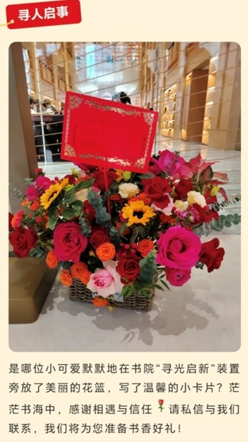 让馆员袁圆印象最深的是,去年新年,服务台收到一个匿名的花篮和巧克力,还因此发起了一则特别的寻人启事。