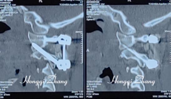 而张宏其教授团队在刮除病灶后,采用单纯后路病灶清除、左侧环椎椎弓根+无导针引导的徒手Magerl技术,右侧单用环椎椎弓根钉,及C3、4钉棒固定,再植骨。