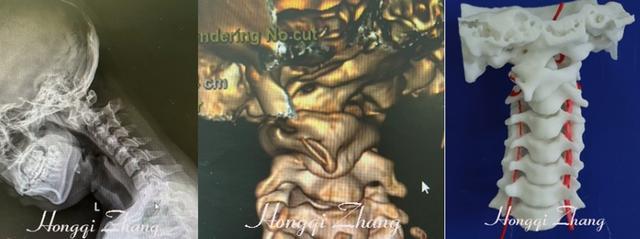 ▲牵引前X片、CT三维重建、3D打印模型示:环枢关节90 °旋转脱位