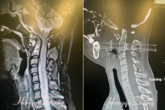 ▲核磁共振、CT示:环枢关节严重脱位、齿状突压迫到颈髓