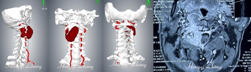 ▲3D打印模型示:肿瘤的位置及大小(红色块状)、红色条状系椎动脉。核磁共振示:右侧环椎后弓破坏、椎动脉被肿瘤浸润包裹