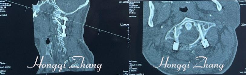 由于目前Magerl技术所需的空心螺钉以及钛缆目前无法获取。张宏其教授经过反复思考后,决定采用无导针引导的徒手Magerl技术与椎弓根螺钉技术结合的方式为小倩进行手术,旨在能够在最小的创伤下恢复正常的环枢关节对位关系,通过强有力内固定方式,使其能够尽快重返正常学习生活。