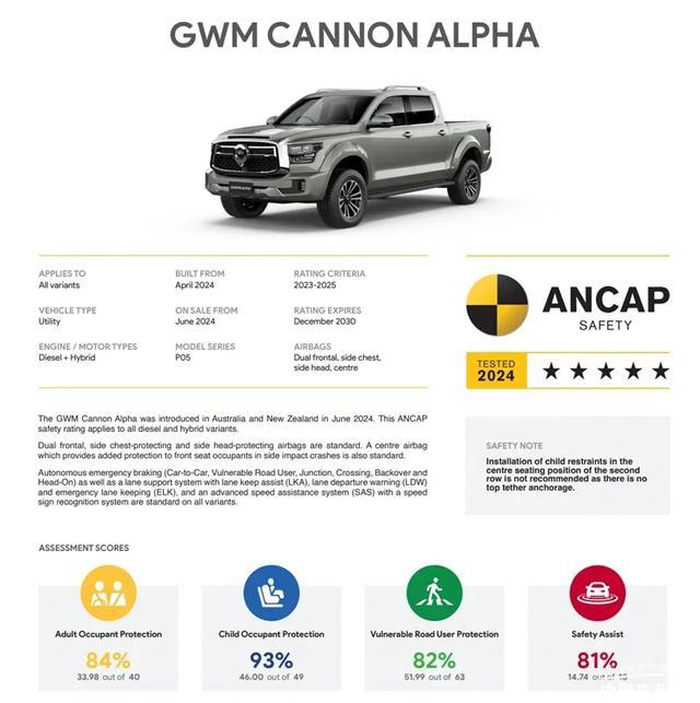 在澳洲A-NCAP测试中,长城山海炮在成人乘员保护方面获得84%、儿童乘员保护方面获得93%、行人保护82%以及安全辅助81%成绩,四个方面均获得较高的分数,综合成绩达到五星认定标准。