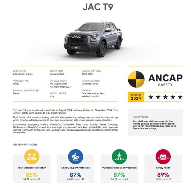 江淮T9在面对澳洲ANCAP全新测试规程下,以出色的成人保护与行人保护等多维度安全设计,获得新规下综合评分最高分皮卡殊荣。此成绩足以说明在澳洲这块皮卡流行圣地,中国皮卡的安全设计完全不输我们眼中的那些进口皮卡,根据澳洲ANCAP评定结果,江淮T9获得五星安全成绩,江淮T9国内对应车型就是全新悍途。