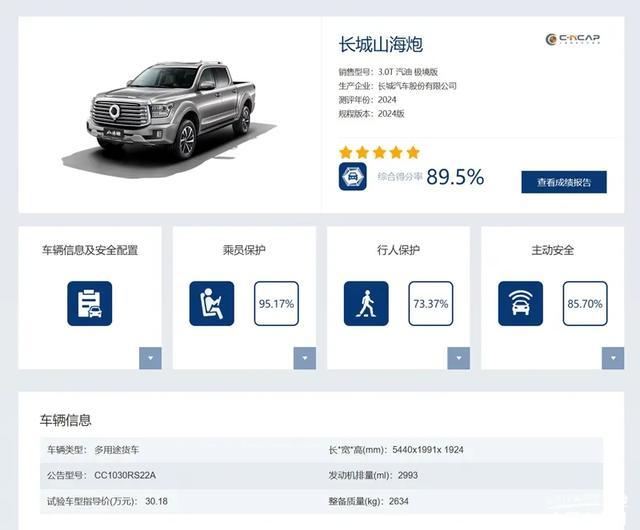 另外,在中国国内的C-NCAP测试中,长城山海炮以高达89.5%的综合得分率荣膺五星安全评级,成为C-NCAP 2024版新规程下首款五星安全认证皮卡。