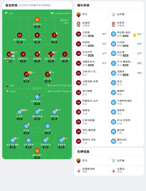 北京时间1月6日3:45,意甲第19轮,罗马对阵拉齐奥。上半场,夸迪奥-科内抽射被扑出,佩莱格里尼兜射破门斩获本赛季联赛首球,随后萨勒马克尔斯扩大比分。下半场,卡斯特利亚诺斯小角度打门被扑,贡多齐远射被门将化解,努诺-塔瓦雷斯小角度抽射打偏,比赛补时阶段塔蒂染红,最终,罗马2-0拉齐奥。