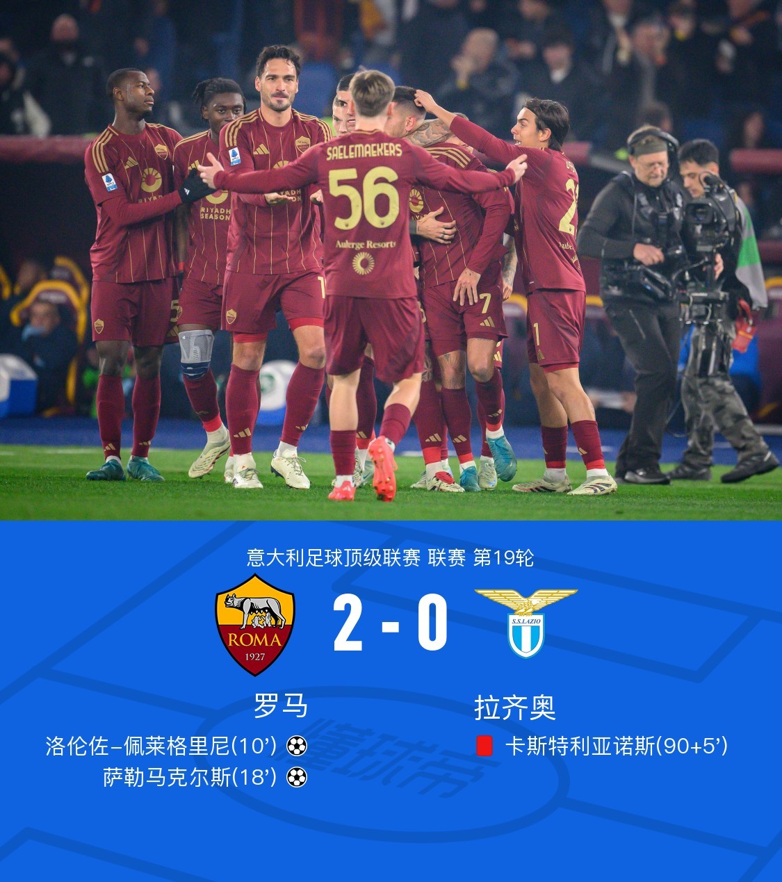 第18分钟,萨勒马克尔斯低射被扑出,随后跟进补射破门!罗马2-0