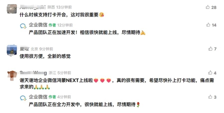 关于信息安全,企业微信鸿蒙Next版在行业中表现突出,是国内首个获得信息安全领域认证“大满贯”的办公软件,许多银行和公安机关也在使用。为了更好地保护企业数据,软件还支持私有部署,提供更强的安全保障。官方表示,未来企业微信鸿蒙Next版将持续丰富功能,快速迭代,用户期待的“打卡开会”功能也在加速开发中,预计很快上线。