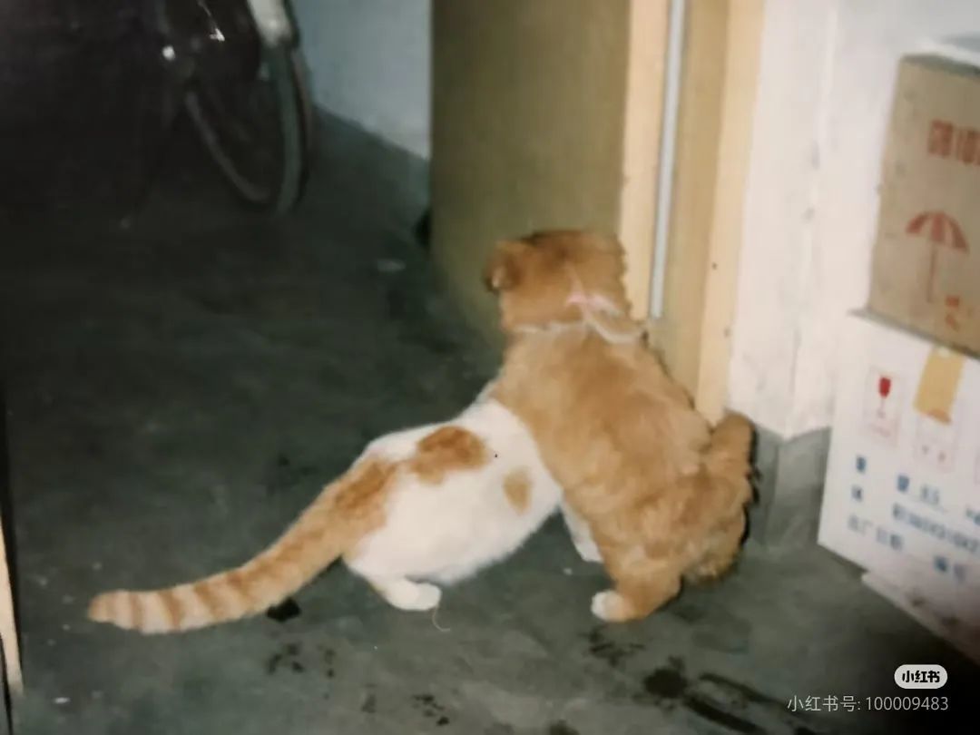 小猫和小狗在老家属楼的水泥地上玩闹↓