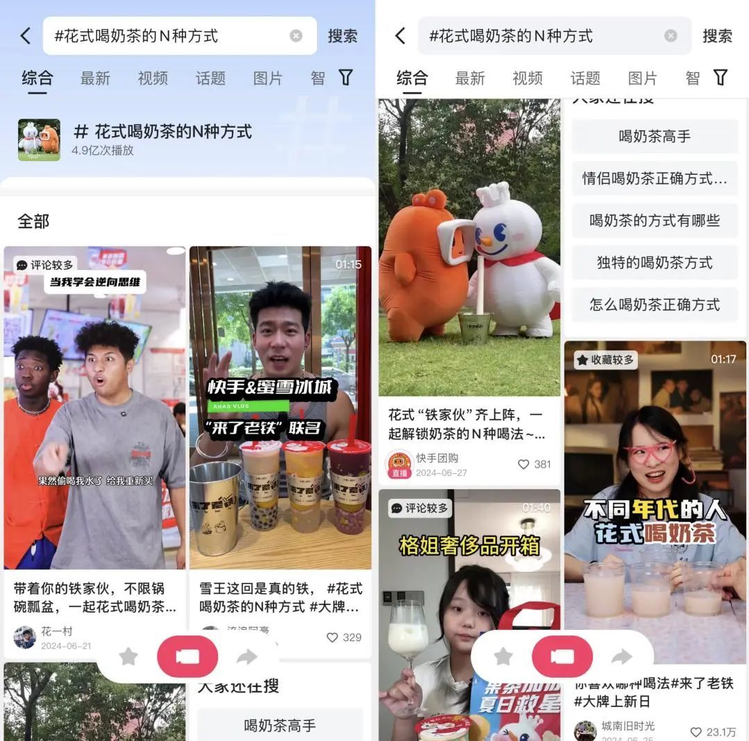 为进一步激发用户的参与热情,快手还发起了#花式炫奶茶的N种方式 话题挑战赛,将花式喝奶茶的100种姿势充分演绎,将饮品软性植入挑战赛玩法中,“润物细无声”中触达年轻的消费群体。