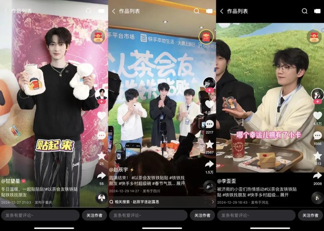 快手邀请艺人甘望星和快手达人赵辰宇、李歪歪,在济南霸王茶姬门店举办了一场“铁铁贴贴供暖行动”。活动借势于明星和达人的影响力,让粉丝真实感受到贴贴的温暖,感受到品牌联动的魅力,进而激发大家做“自来水”传播,扩大品牌影响力。
