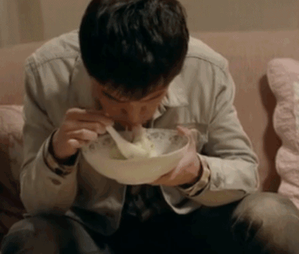 饥肠辘辘的他,笑着将粥喝下,