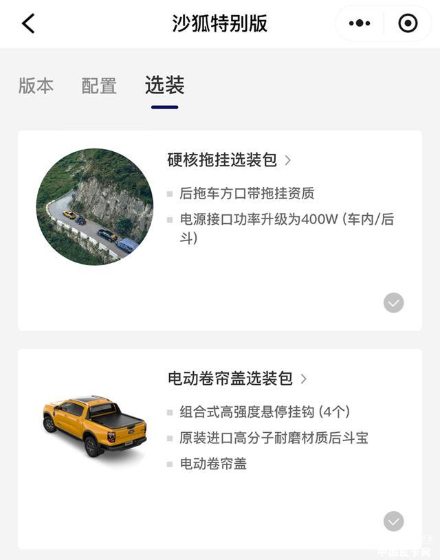 内饰部分变化不大,主要在越野功能方面更加重视。新车拥有EMOD智能四驱系统,并且仅有8AT变速箱可以选择。动力方面,2.3T汽油和柴油发动机均可以选择。另外整车的更换了FOX定制氮气减震器,增加了底盘护板,在飞跳、搓板路方面有更强的可靠性。据悉,现在在小程序预订还可以享受限量优惠,前100名预订者支付5000元意向金享受价值9800元电动卷帘盖选装包。