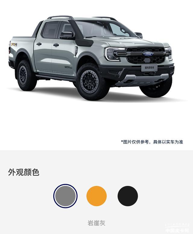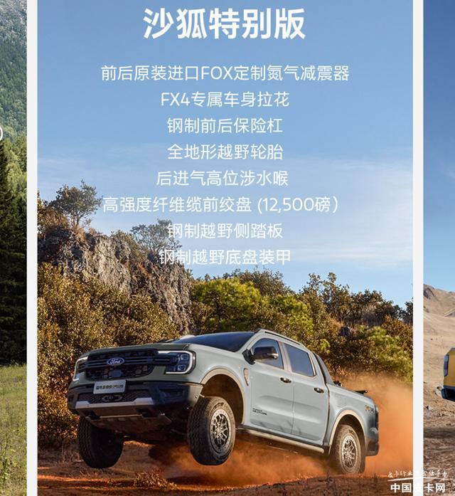 外形方面,新车与1st edition有些类似,整体上都是原厂改装皮卡的设定。配置方面,沙狐特别版将会配备FX4专属车身拉花、钢制前后保险杠、侧踏板、全地形越野轮胎、后进气高位涉水喉、前部12500磅绞盘等越野套件,提升户外防护能力和脱困性能。另外电动卷帘盖、货箱宝等为一选装包,后拖车方口、货箱电源接口为另一选装包。整车有灰色、黄色和黑色可以选择。