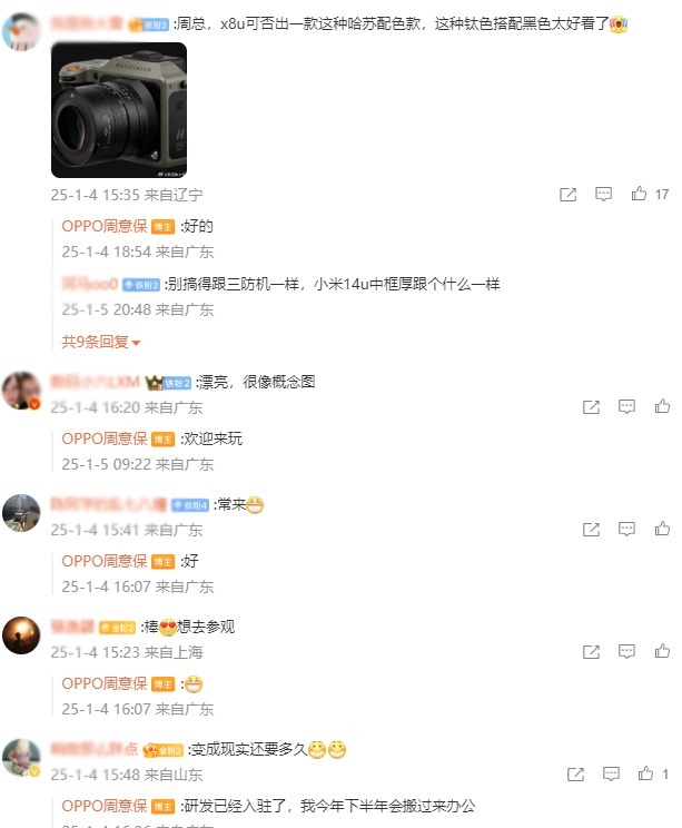 周意保分享一条滨海湾园区的微博,在回应有关OPPO Find X8 Ultra的相关评论时,对推出“哈苏配色款”OPPO Find X8 Ultra表示同意,即有可能推出(钛色搭配黑色)的OPPO Find X8 Ultra。