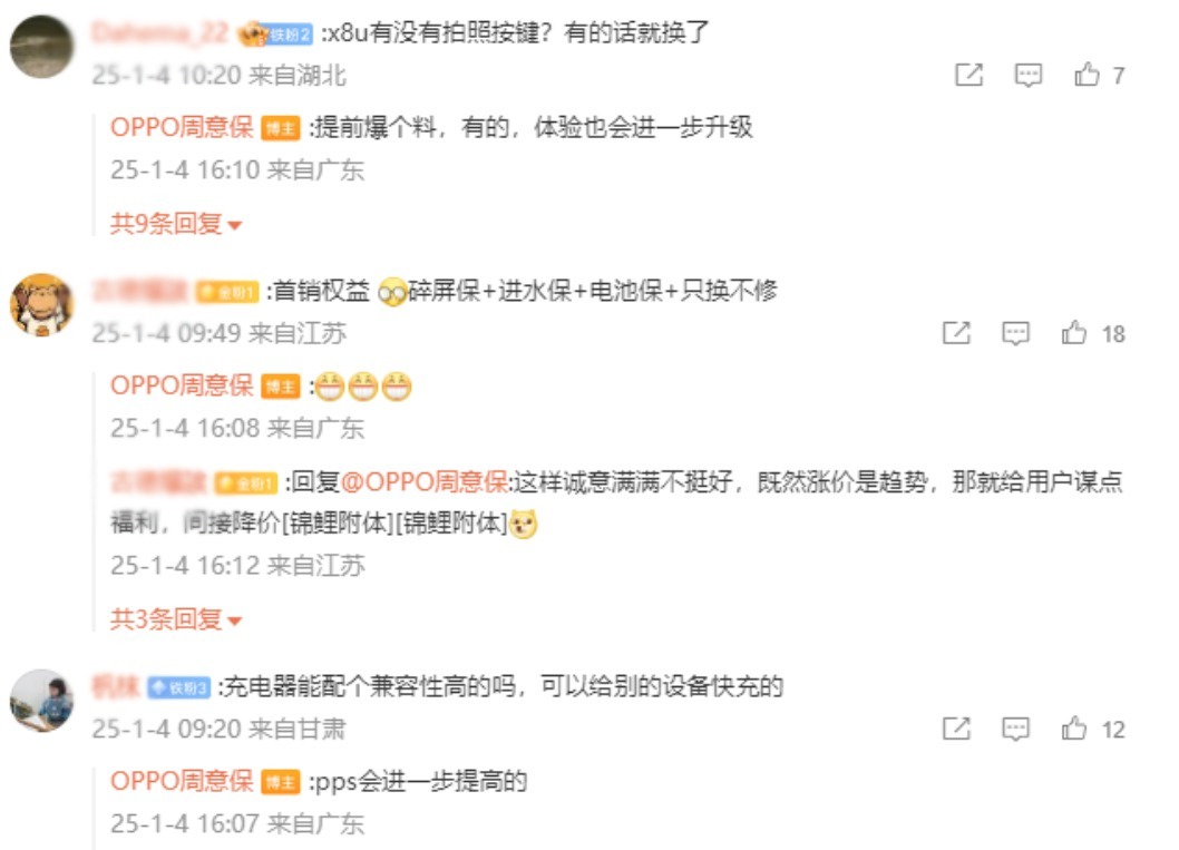 在此前OPPO Find N5和OPPO Find X8 Ultra调研中,周意保表示OPPO Find X8 Ultra将配备拍照按键,体验也会进一步升级;OPPO Find X8 Ultra的充电头PPS会进一步提高,即兼容性增强;OPPO Find X8 Ultra首销权益有可能是碎屏保+进水保+电池保+只换不修。