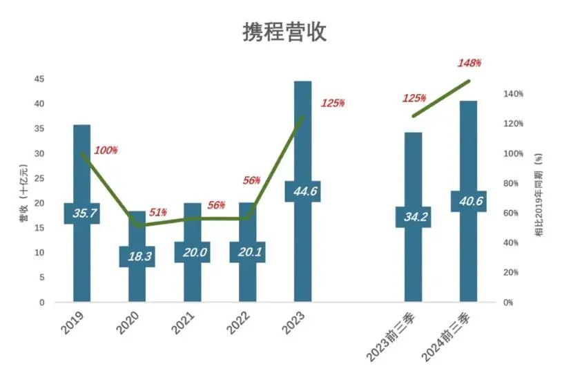 2023年,随着旅游需求的全面复苏,携程营收达到446亿,相较2019年增长了25%。2024年前三季度,营收已达406亿,为2019年同期的148%。从2019到2024年的年均复合增长率为8.2%,携程不仅追回了因疫情损失的时间,还显著超越了疫情前的水平。