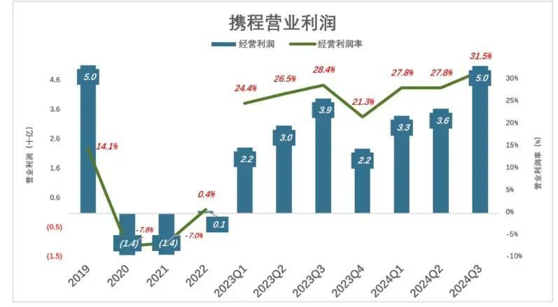 2024年前三季度,携程营业利润达到118.8亿,利润率高达29.3%。其中,Q3单季度利润率为31.5%,这一数字已经超过2019年全年。疫情的冲击让携程在困境中实现了经营效率的突破,为后疫情时代的高速增长打下了坚实基础。