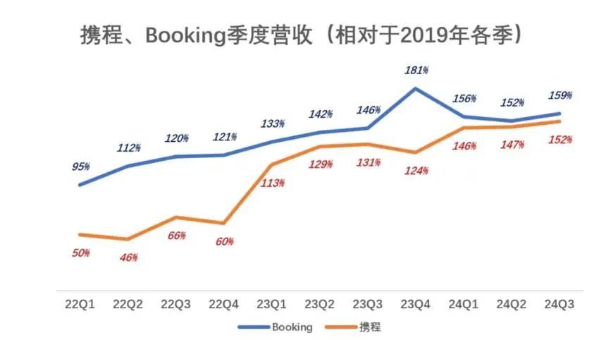 国际在线旅游巨头Booking的复苏进程领先携程一年。2022年,Booking的营收已全面恢复至2019年水平,携程则在2023年开始赶超。到2024年Q3,携程营收为2019年同期的152%,与Booking的159%相差无几。2024年末,携程的市值已达到2019年峰值的163%。