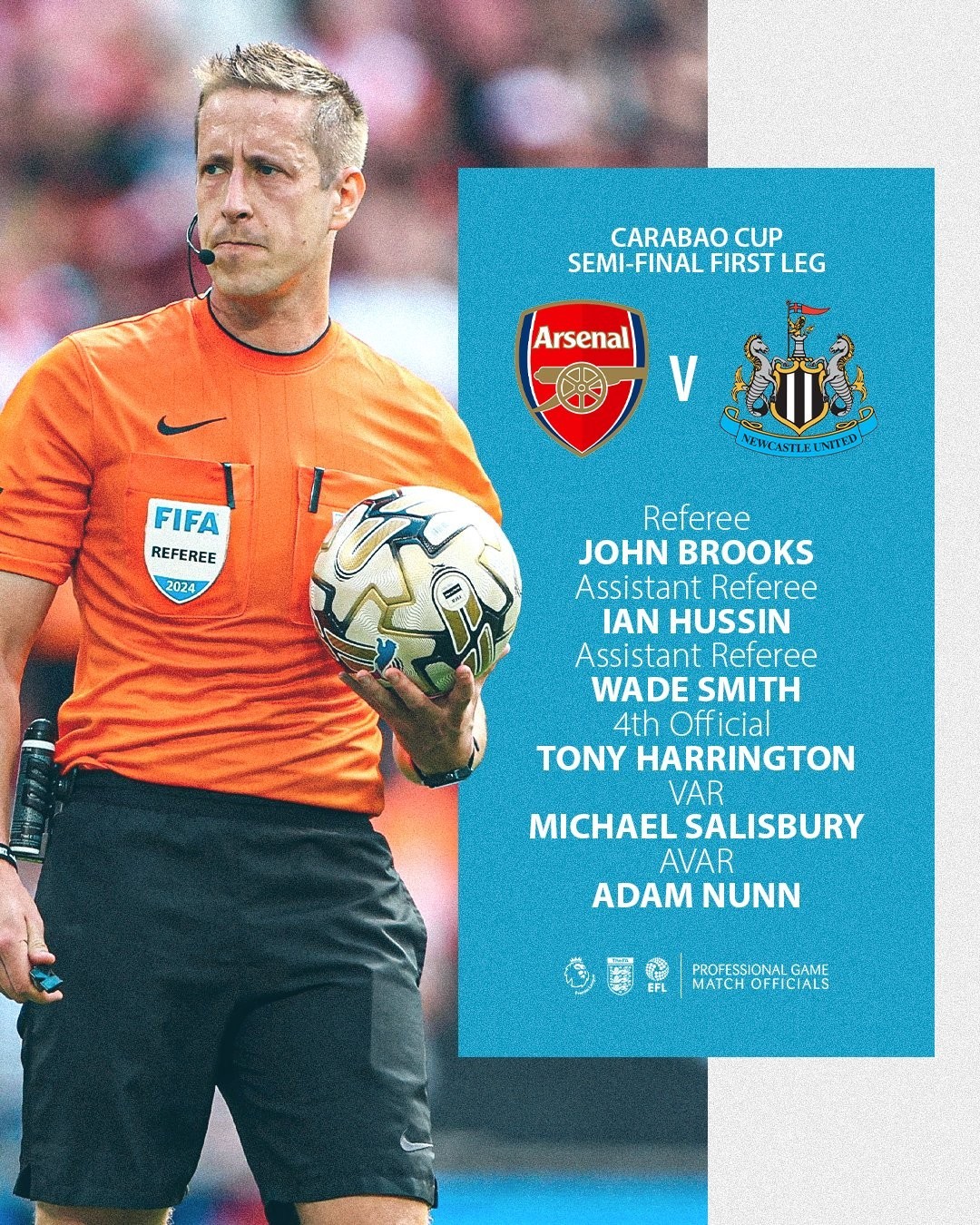 北京时间1月7日凌晨,英格兰职业裁判公司(PGMOL)公布了英联杯半决赛首回合的裁判安排,其中约翰-布鲁克斯将执法阿森纳对阵纽卡的比赛,而阿特维尔将执法热刺对阵利物浦的比赛。