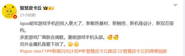 据爆料,iQOO明年将加大对游戏手机领域的投入,全新的iQOO Neo 11系列可能将采用全新的散热材料、全新的触控策略、全新的机身设计和全新的双芯片架构,金属机身也将从旗舰级机型下放。此外,iQOO还将在iQOO Neo 11系列上联合多家游戏厂商进行联合调校,目标要坐游戏手机头部。