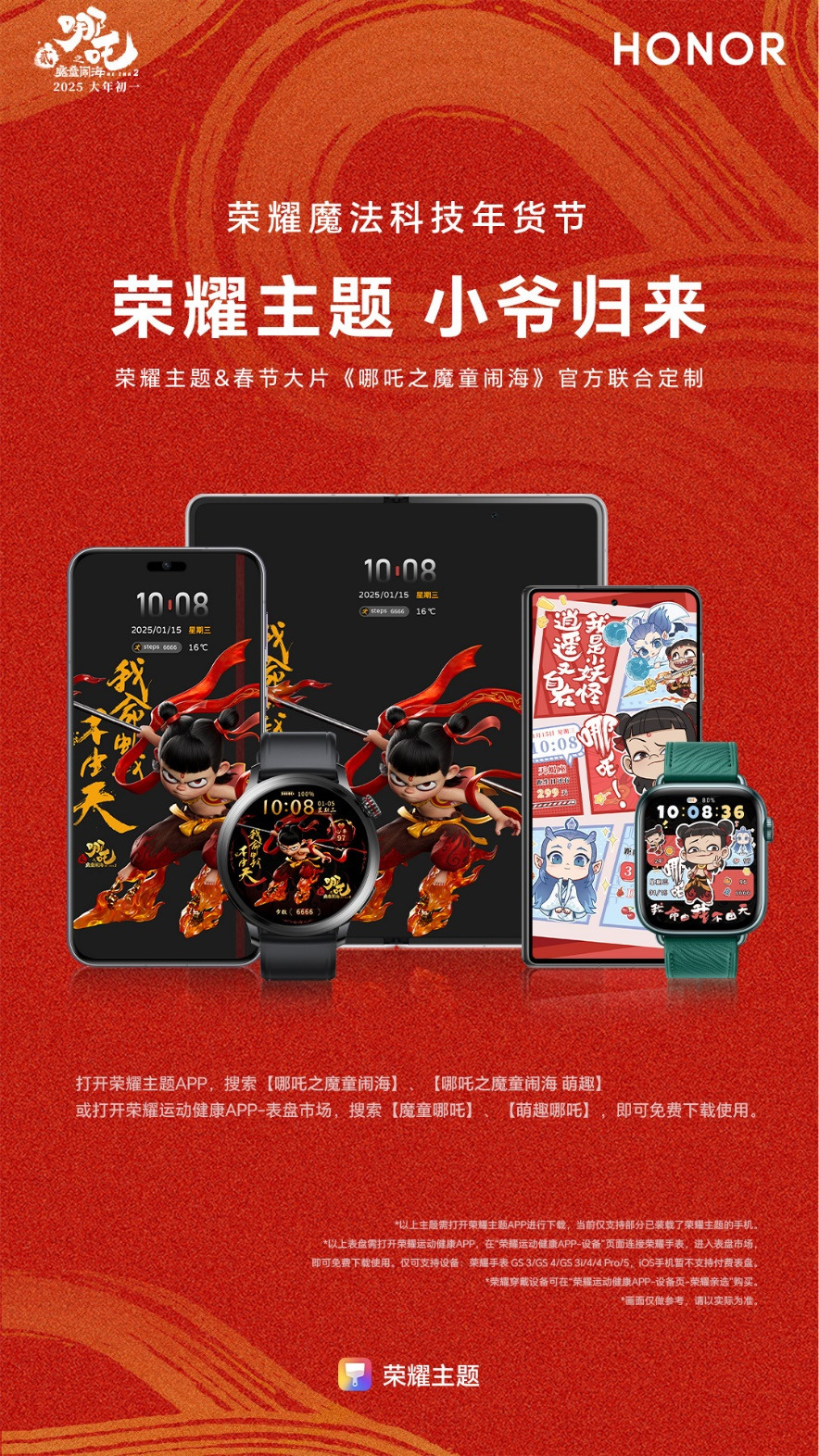 近期,荣耀官宣成为《哪吒之魔童闹海》官方合作伙伴,并同步开启2025荣耀魔法科技年货节。本次小爷“哪吒”借荣耀年货节抢先“归来”,喜欢哪吒的荣耀手机用户朋友可以赶紧抢先体验起来!现在就打开荣耀主题APP,搜索“哪吒之魔童闹海”、“哪吒之魔童闹海 萌趣”或打开荣耀运动健康APP-表盘市场,搜索“魔童哪吒”、“萌趣哪吒”,即可免费下载使用。