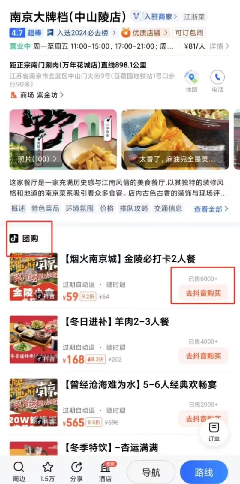导语:在高德地图上,搜索部分店铺可发现抖音团购链接,点击“去抖音购买”,则可直接跳转至抖音App。