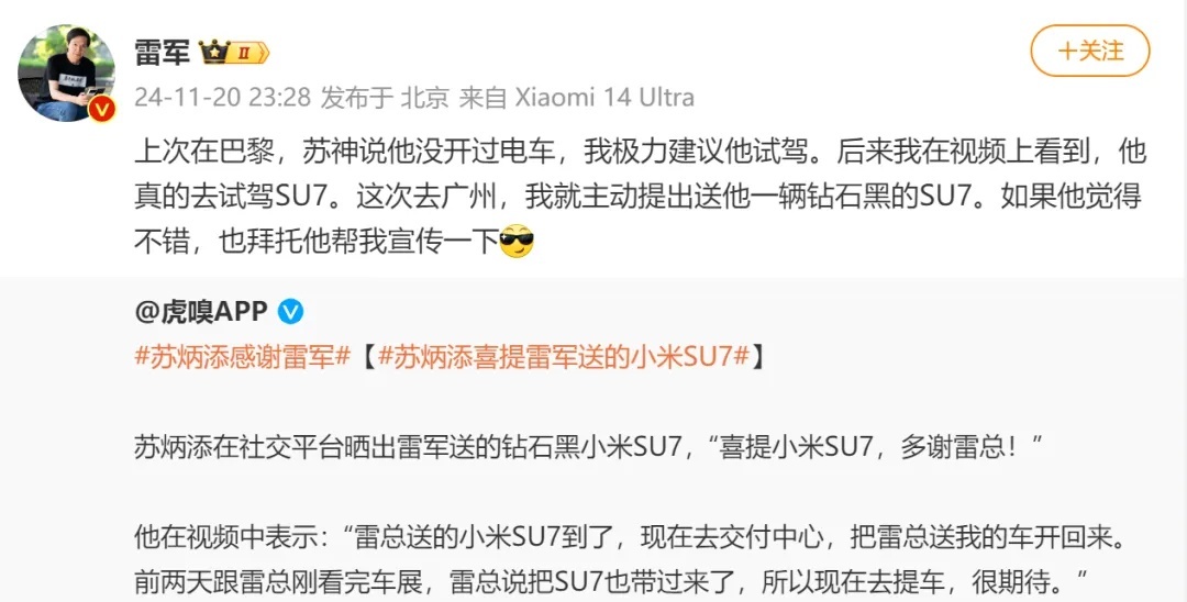 20日晚,雷军回应称:“上次在巴黎,苏神说他没开过电车,我极力建议他试驾。后来我在视频上看到,他真的去试驾SU7。这次去广州,我就主动提出送他一辆钻石黑的SU7。如果他觉得不错,也拜托他帮我宣传一下。”