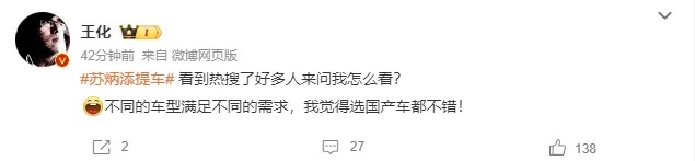 对此,小米公关负责人王化回应称:“看到热搜了,好多人来问我怎么看?不同的车型满足不同的需求,我觉得选国产车都不错!”