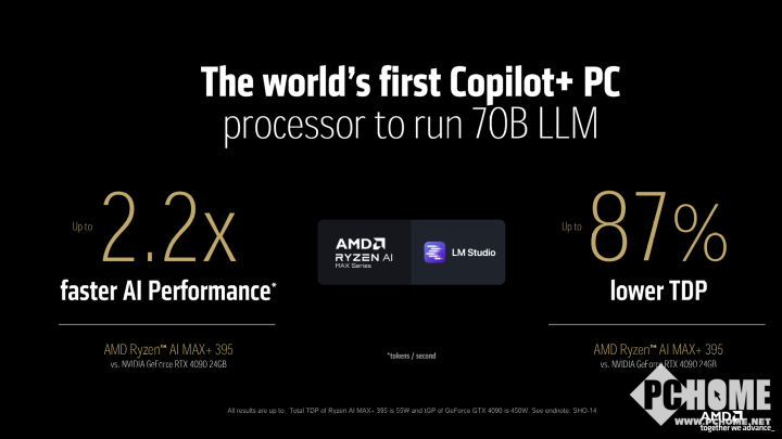 由于锐龙AI Max系列处理器都会配备较大容量的内存,采用共享内存的方式就对于运行较大的LLM模型更为友好,AMD对比了锐龙AI Max+ 395和NVIDIA RTX 4090,在运行70B大小的LLM时,锐龙AI Max+ 395凭借共享内存的优势,AI性能是RTX 4090的2.2倍,而功耗则比对手低87%。