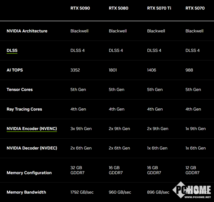 全新的NVIDIA Blackwell架构配备第五代Tensor Core,借助FP4和DLSS 4,提供强劲AI性能。目前官网已经更新了该系列首发显卡的部分规格信息,详情请见上图。
