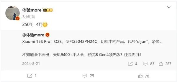 博主体验 more 爆料,小米 15S Pro 将在今年 4 月份亮相。