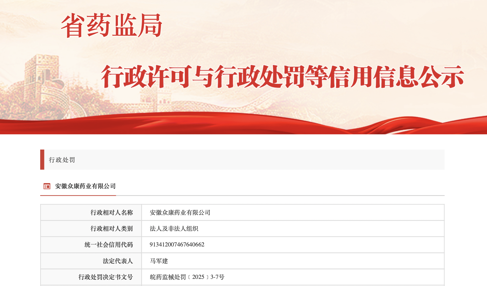 资料显示,安徽众康药业有限公司是集科研、开发、生产、销售为一体的高科技股份制企业,成立于2003年。据天眼查,2024年8月23日,该公司曾因违反《医疗器械监督管理条例》,被安徽省药监局没收违法生产的远红外筋骨伤痛贴(批号20231101)2558袋、远红外消痛贴(批号20240101)1040盒,并处3.8万元和4.0万元罚款,共7.8万元。