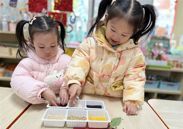 扁扁的红豆,圆圆的大枣,糯糯的紫米……这些食材你会区分吗?小朋友们识五谷、挑豆子,正在认真专注的进行着食材分类游戏呢!