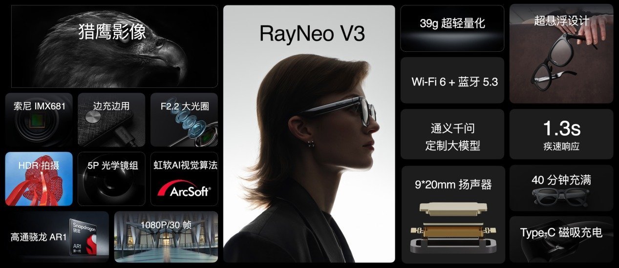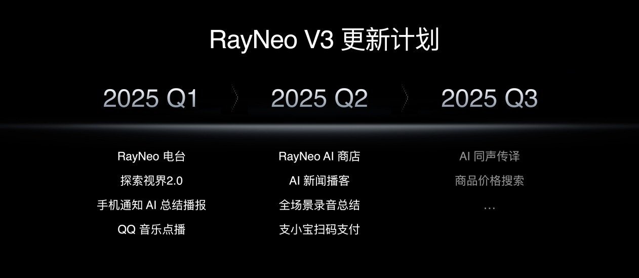 雷鸟V3将陆续上线RayNeo 电台、探索视界2.0、手机通知AI总结播报、QQ音乐点播、AI新闻播客、全场景录音总结、支小宝扫码支付等丰富功能。