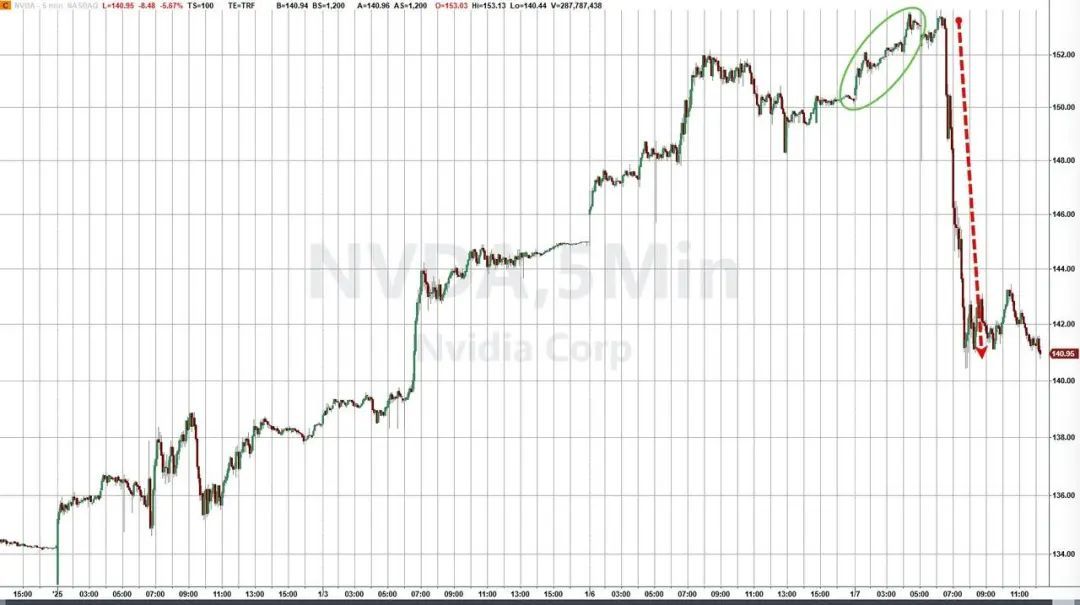 美东时间1月7日周二,英伟达股价高开,盘初曾涨近2.5%,后大幅回落,开盘不到半小时后即转跌,此后持续下行,美股尾盘刷新日低时,日内跌6.3%,最终收跌6.22%,报140.14美元,创2024年9月3日以来最大单日跌幅,跌落周一连涨第三个交易日刷新的收盘最高纪录。其最新总市值为3.43万亿美元,市值一夜蒸发2275亿美元(约合人民币16668亿元)。