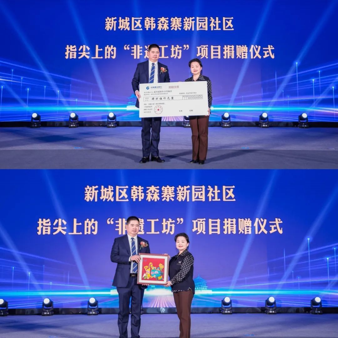 会上还举行了韩森寨新园社区指尖上的“非遗工坊”项目捐赠仪式,西安市福州商会向“非遗工坊”项目改造捐款4.5万元,收到了”非遗工坊“回赠作品。