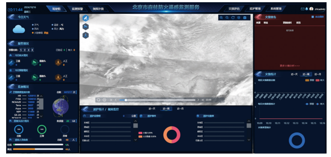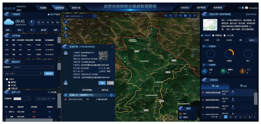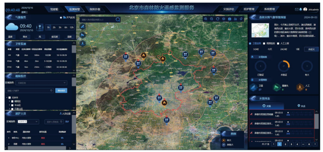 空天地立体监测的防火预警系统使用我国风云系列卫星,日本向日葵9号卫星,以及美国NOAA、EOS、NPP等静止、极轨遥感卫星进行监测。通过卫星组网及算法模型,达到每10分钟一接收、15~30分钟一处理的火点监测频率。同时,林区712路监控覆盖约80%林区,结合无人机日常盲区巡护,实现北京市森林火情监测全覆盖,基于火焰和烟雾识别算法能够精准识别图像中的火点。系统运行以来,卫星共监测372764次,累计预警1423次,监测到火点7起,全面提升了森林火情监测速度与精度。