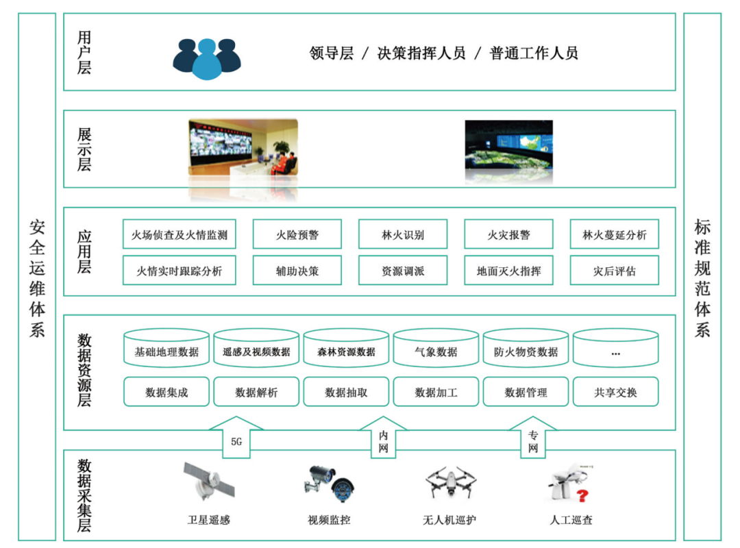 数据采集层是空天地立体监测体系的基础和重要支撑,包括遥感卫星、无人机动态监测、视频监控设备、护林员手持APP等感知设备,能够对森林火灾进行多方位的全面感知,构建一体化的林业监测采集体系。