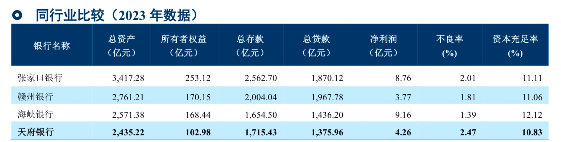 根据披露,截至2024年9月末,四川天府银行数据显示,2024年前三季度,实现营业收入17.25亿元,净利润3.44亿元,总资产2559.48亿元。