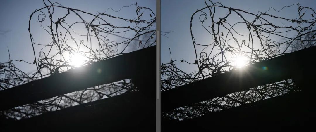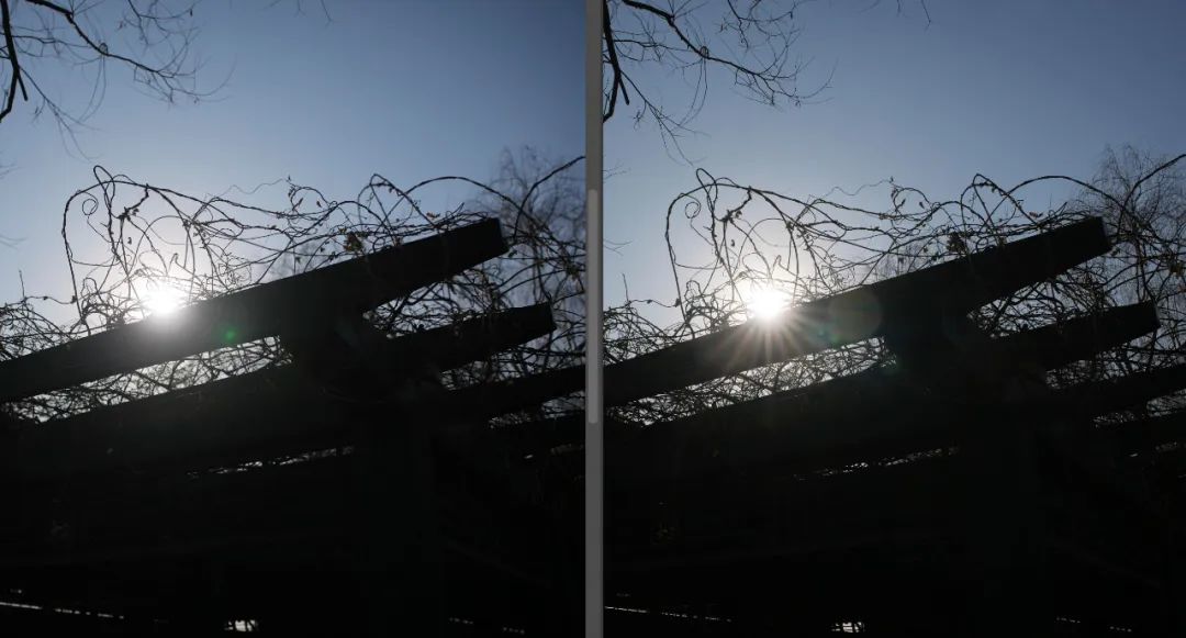 在高光下的树枝边缘部分并未出现可见的色差,最大光圈F2下画面也非常干净,镜头的色差控制表现很好。