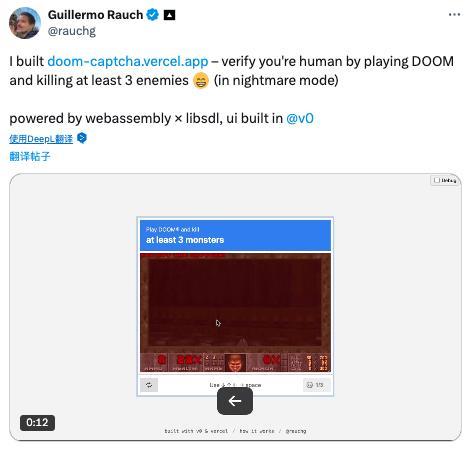 如果你已经习惯了这些常见的验证方式,那接下来的这个可能会让你哭笑不得。云服务平台 Vercel 的 CEO Guillermo Rauch 最近灵光一闪,在 AI 的加持下,推出了一种全新的《毁灭战士》(DOOM)验证方式。简单来说,想证明自己是人类?先得玩这款游戏并在“噩梦模式”里干掉三个敌人,才能顺利进入网站体验功能。