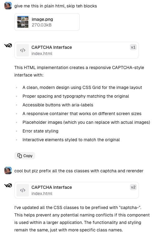 v0 很快就反馈了一个 HTML,由此实现创建了一个响应式 CAPTCHA 样式界面。