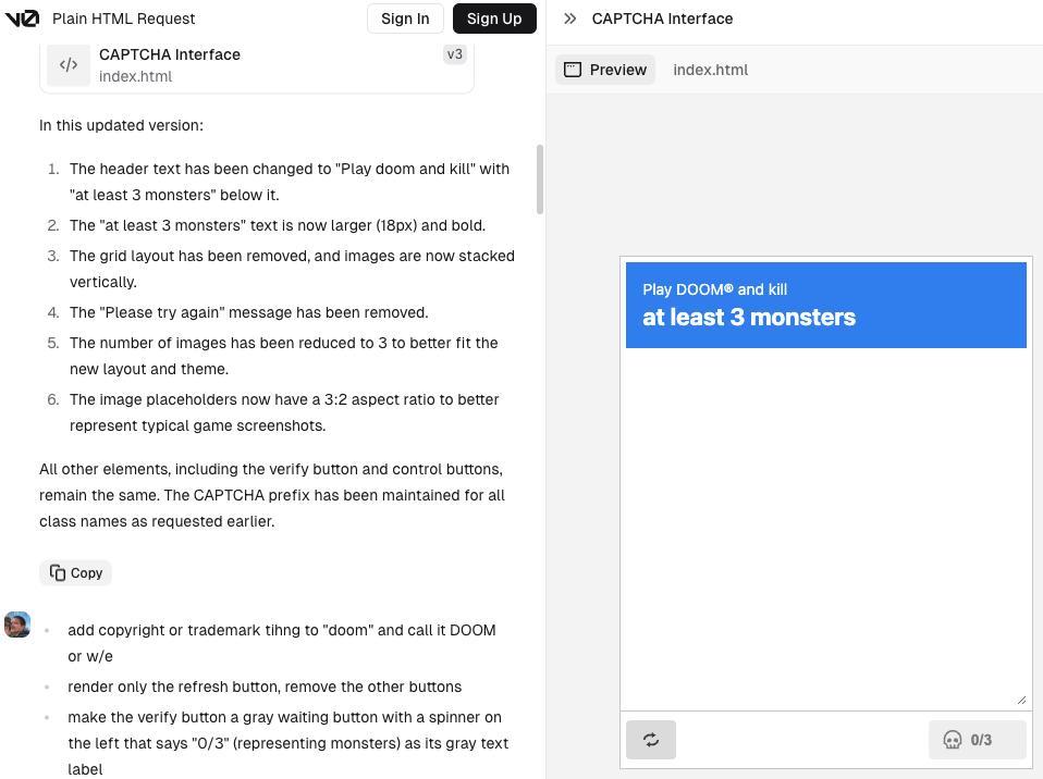 总体来看,这款 DOOM 验证码更像是 Vercel 的 AI 开发工具 v0 的一次技术展示,重点在于展示其生成能力和创意,而非真正的防护工具。对于非游戏玩家来说,这种验证方式难度较高,但作为一种独特的“守门人”机制,它在限制特定访问人群上确实有点意思。