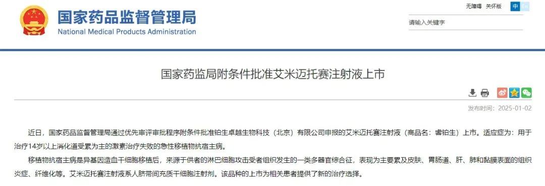 聚美丽从国家药监局官网获悉,国内首款干细胞疗法产品——艾米迈托赛注射液(商品名:睿铂生)于1月2日正式获批上市,该产品专门用于治疗激素治疗失败的急性移植物抗宿主病(以下简称:aGVHD)。